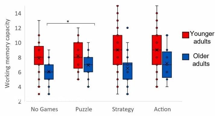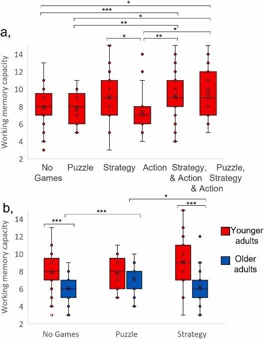 与非玩家相比,年轻成年动作和策略游戏玩家的工作记忆容量**更高。纯动作游戏与提高工作记忆容量之间没有关联。对于年轻参与者,纯动作游戏玩家与非玩家或纯拼图游戏玩家的工作记忆容量得分相等。这个结果不能通过参与者报告的游戏时间差异来解释,纯动作游戏玩家花费的游戏时间明显多于纯策略游戏玩家的人。相反,玩带有策略成分的游戏与工作记忆容量之间存在**关联。尽管非玩家与纯策略游戏玩家之间的比较没有达到统计***(p < 0.063),但纯策略游戏玩家的工作记忆容量明显高于纯动作游戏玩家。此外,玩带有动作和策略元素的游戏玩家在工作记忆容量方面表现更好,但纯策略游戏玩家相比没有达到统计***,进一步表明对于年轻成年人来说,策略元素而不是动作游戏元素与更高的工作记忆容量相关联。