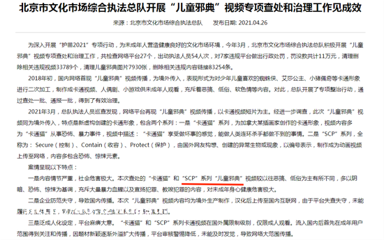 5月2日,自今年2月以来,执法总队开展了关于“儿童邪典”视频的专项查处和治理工作,对7家违规平台做出了处罚,共清理相关违规视频33789个,清理儿童邪典图片7930张,删除相关违规内容链接83254条。公告中,“SCP系列”被列为“儿童邪典”的一种。公告还称,较以往恶搞、低俗为主的“儿童邪典”视频不同,“SCP”系列等视频多以阴暗、**、惊悚为基调,充斥大量****以及宣扬、****的内容,“对未成年身心健康****。”