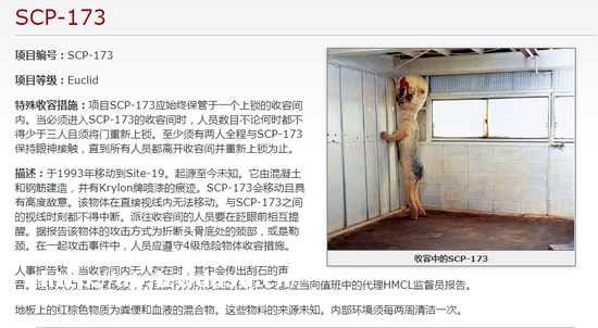 “SCP”系列起源于2007年美国网友于4chan论坛上发布的一篇****,**以机密资料的口吻虚构了一个叫“SCP”的机构,该机构收容了一个危险生物,编号173。SCP-173的角色设定是,当有人盯着它时,它无法行动,一旦盯着它的人视线转移或眨了眨眼,SCP-173会瞬间移动到对方眼前,并拧断对方的脖子。