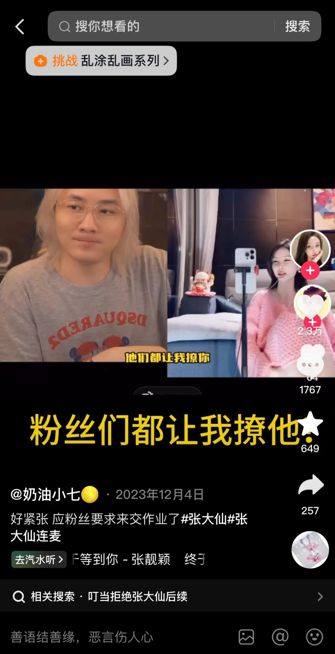 此后,张大仙与**才艺主播们连麦PK,爆发的i人属、如坐针毡的尬聊、拘谨的神态,张大仙也贡献了不少名场面。还被粉丝调侃,“没想到能这么尴尬,终于知道他没对象的原因了。”