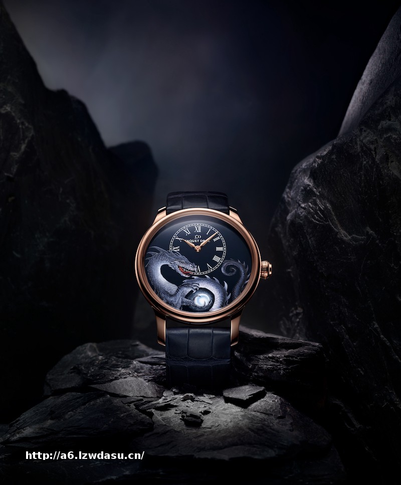 雅克德罗为约翰·豪提供其经典偏心时分小针盘作为画布,以便他在表盘上留下其**的风格、印记和灵感。深蓝色大明火珐琅背景上,巨龙图案栩栩如生,其身躯盘旋于以红金或白金打造的41毫米直径表壳中。