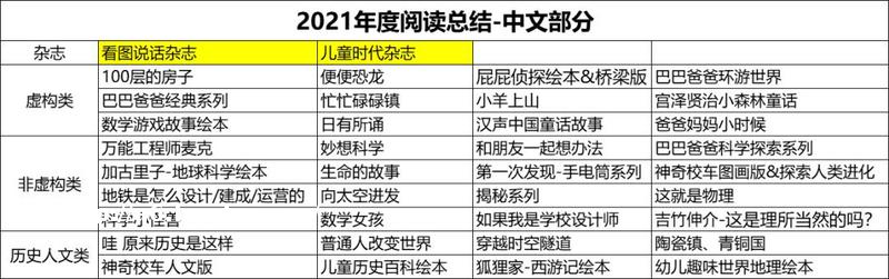 2021年的书单,我们参考上面的大原则进行划分,但将非虚构类进一步划分:科普和历史人文,再加上杂志期刊,共汇总成以下四类:
