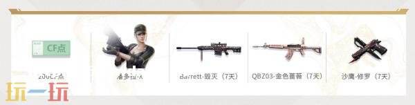 其他道具奖励:高爆手雷 -雷蛇(7天)、粉色烟雾弹 -维纳斯(7天)、 闪光弹 -小乔(7天)、沙鹰-修罗(7天)、屠龙(7天)、M4A1-黑骑士(7天)、Barret-毁灭(7 天)、葵(7 天)、加特林 -炼狱(7 天)、KAC-圣炎切割者(7天)、 挑战弹匣(30 天)、次元之矛 -背包(30 天)、次元之-头盔(30 天)、终*泰坦水壶(7 天)、终*泰坦手袋(7天)、变异宝贝(30 天)、 迷你生化手雷 (30 天)、 **之刃(30 天)、生化弹匣(30 天)、闪光护目镜(30 天)、烟雾保护头盔(30 天)