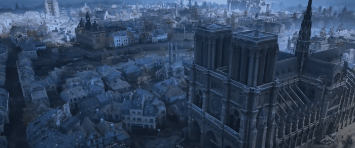 2019年,巴黎圣母院发生火灾,尖顶遭受破坏。游戏开发公司育碧(Ubisoft Entertainment)立即决定在当周免费赠送《刺客信条大革命》,支持古迹的修缮,其中自然包括巴黎圣母院的具体构造情况。