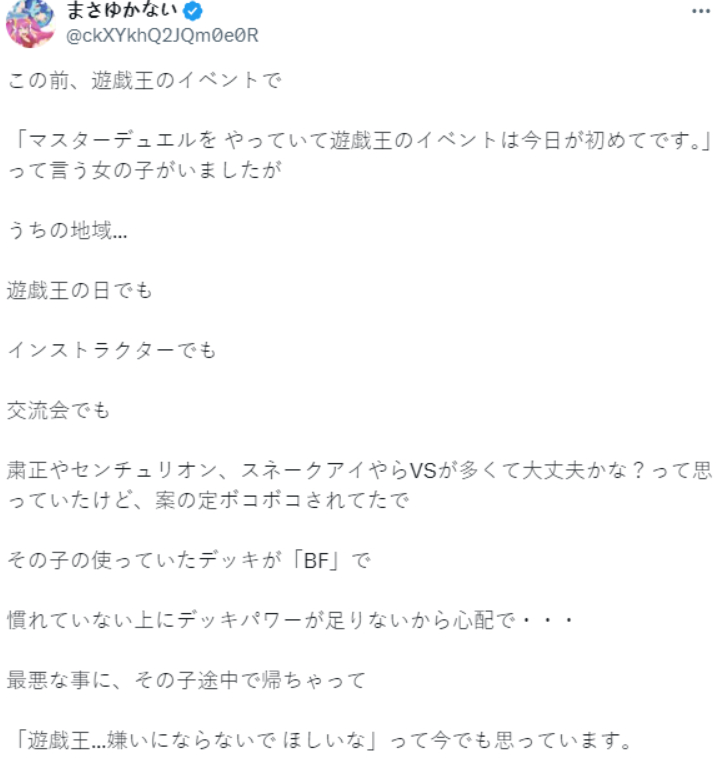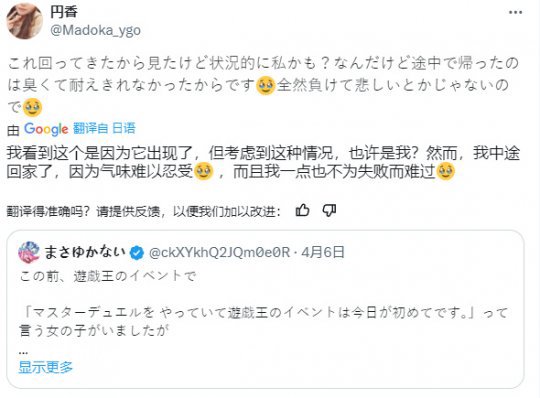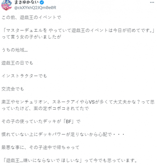 《游戏王》玩家まさゆかない近期在网上发布了动态,提到了自己参加线下比赛时,遇到了一位女玩家的经历。对方是个新手,在输了一场对决后就中途离场了。