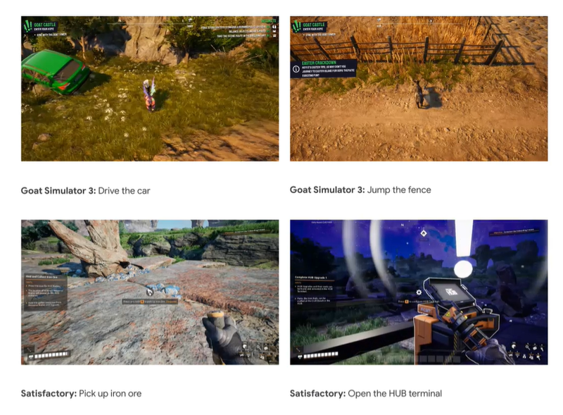 为了训练出能够适应不止一款游戏的通用型游戏AI,在《无人深空》《模拟山羊3》《幸福工厂》等九款在玩法和操作上截然不同的视频游戏中对SIMA进行了训练和测试。DeepMind为SIMA展示了玩家组合游玩不同游戏以及自由游玩的录像,以及语言和行为之间的联系。