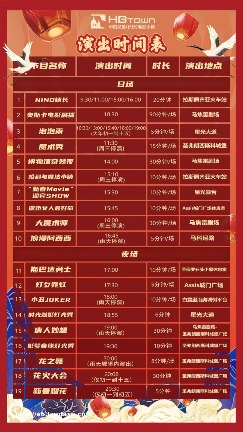 即日起至2月19日,华谊兄弟(长沙)电影小镇开启“阿西西**节”活动,好彩摸鱼街、祈福孔明灯、花火大会、泡泡雨、新春烟花精彩上演。