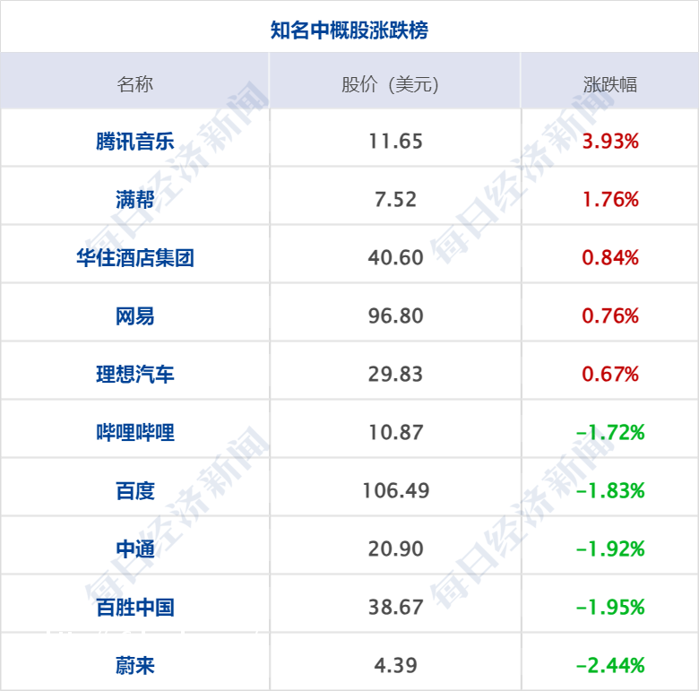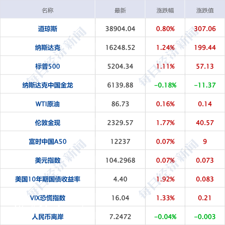 美股三大指数集体收涨,道指上涨307.06点,涨幅0.80%,本周累跌2.27%,纳指涨1.24%,本周累跌0.80%;标普500指数涨1.11%,本周累跌2.27%。大型科技股多数上涨,奈飞、Meta涨超3%,亚马逊、英伟达涨超2%,微软、谷歌涨超1%,特斯拉跌超3%,英特尔跌超2%。中概股涨跌不一,纳斯达克中国金龙指数跌0.18%,本周累涨0.37%。爱奇艺涨超4%,腾讯音乐涨超3%,满帮、富途控股涨超1%,网易、理想汽车、拼多多小幅上涨。蔚来跌超2%,哔哩哔哩、百度跌超1%,京东、小鹏汽车、阿里巴巴、唯品会小幅下跌。