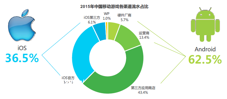 Android依旧*占鳌头,接近iOS渠道的两倍。其中,硬件厂商和运营商的占比逐渐扩大。
