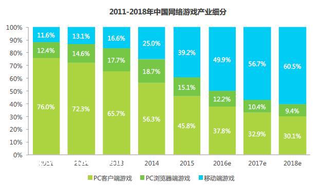 移动端游戏市场份额逐年增长,到2015年为止已增至39.2%,而端游份额则跌落至50%以下。
