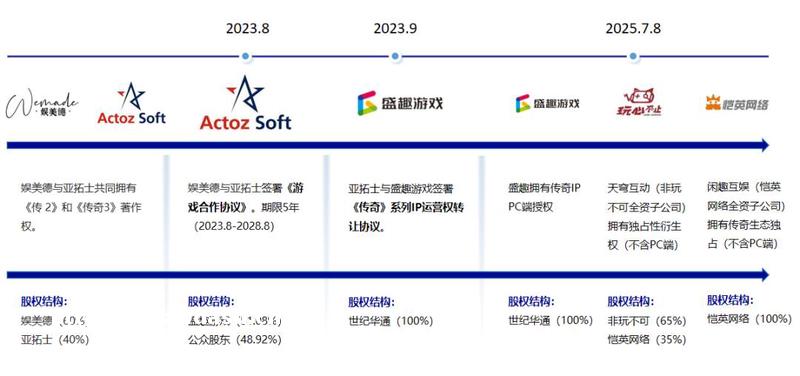 IP版权方(如盛趣游戏、亚拓士、娱美德等)居于核心地位,通过**费与分成模式实现收益。目前国内传奇IP版权问题已经基本解决,具体如下:2023年9月,协议明确了《传奇》游戏IP在中国大陆的权利归属,而盛趣游戏通过亚拓士继续保持对《传奇》系列IP在中国大陆的*占运营权;2025年4月6日,