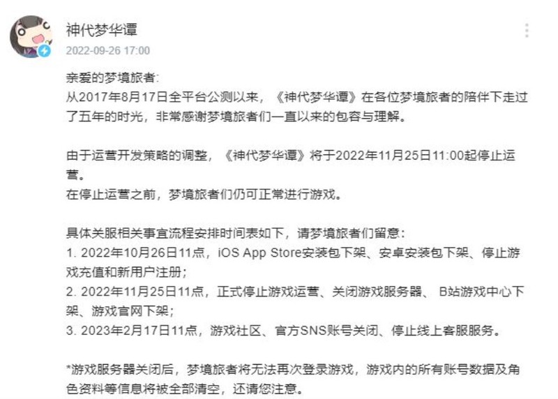 《神代梦华谭》属于海战棋+策略卡牌玩法,游戏难度方面对新手玩家并不友好。在最基本的游戏体验上,不少玩家也表示,游戏经常卡Bug,人物的平衡*很差。在苦苦支撑几年后,今年9月,表示将于2022年8月2日停止运营。