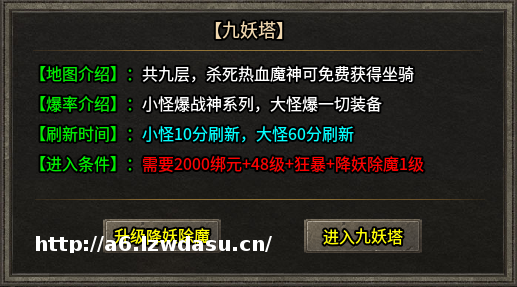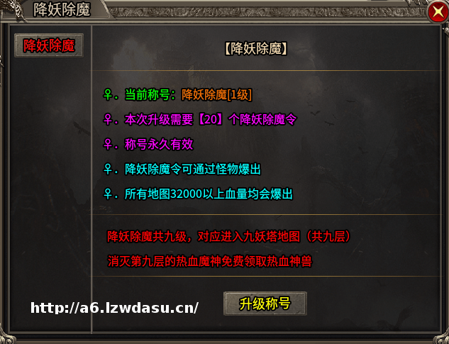 除了属*加成外,降妖除魔称号还是进入“九妖塔”的通行证,每提高**就能进入高一层的塔,在**的第九层里能够见到boss热血魔神,它能掉落热血神兽坐骑,不但实用,也是你战力的象征。