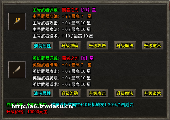 50级之后,可以去找盟重左上角的摆摊**市场NPC进入庄园地图,里面的“寂火神匠”能为你提升武器属*星级,攻魔道任意一条星级+10就能随机获得1-20%的合击威力属*,但只有一次,如果触发的是1%……emmm,