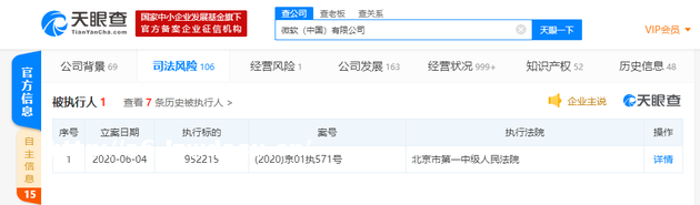 6 月 8 日下午消息,近日,微软(中国)有限公司新增一条被执行人记录,执行**为北京市**中级人民**,执行标的 952215,案号为 (2020) 京 01 执 571 号。