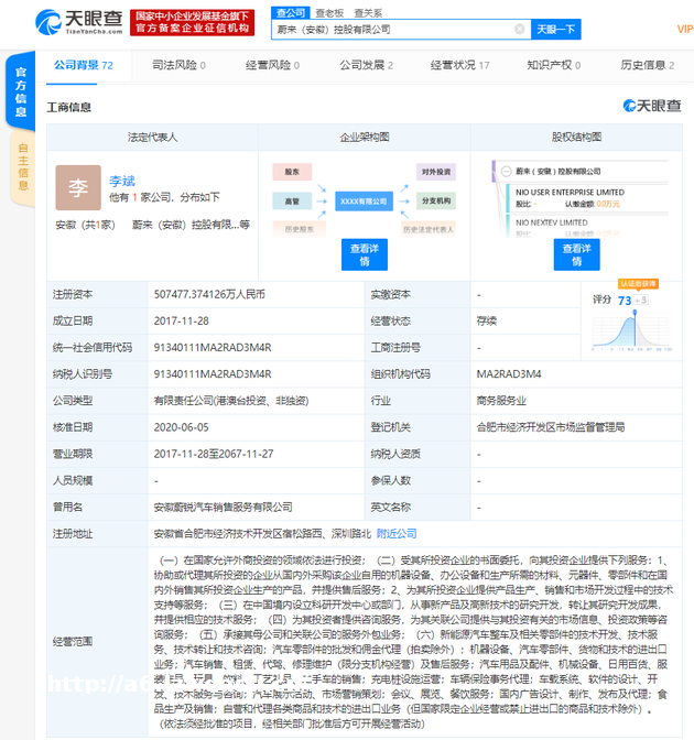 蔚来(安徽)法定代表人变更为李斌,注册资本增至 50 亿
