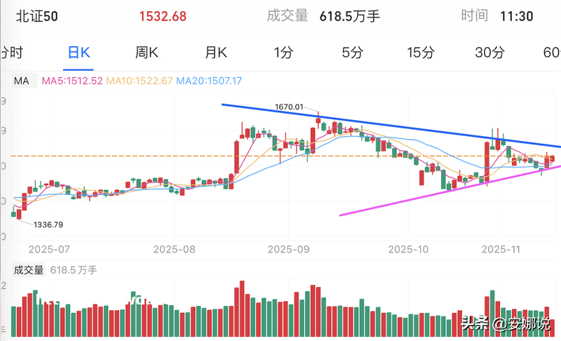北证50 近期一直处于盘整期,最近在前低支撑位突然放量大涨,但很快回落,并形成对称三角形,这两日反弹,守住下沿支撑位,继续盘整中,后市方向不明。