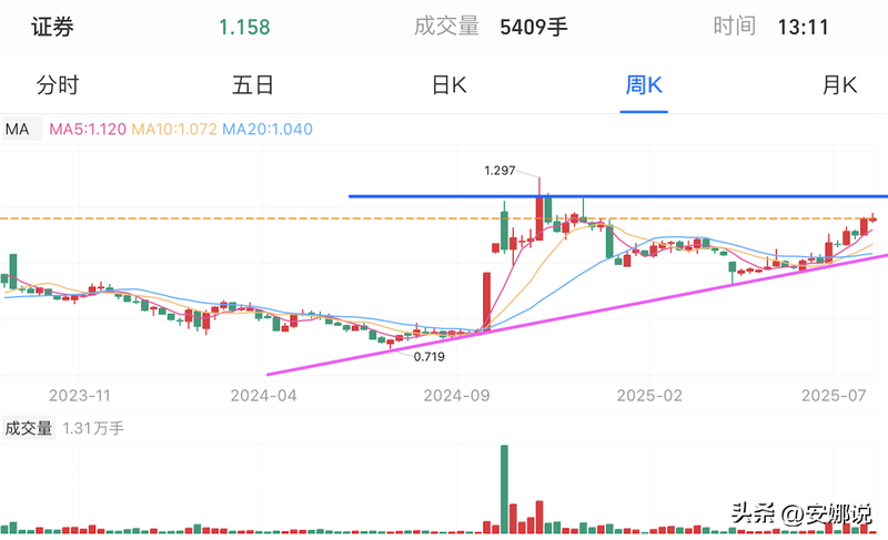 **中长期一直震*上行,最近力竭回调,已经跌破上行趋势线,且伴随放量。这几日已经跌破上涨趋势线,短期趋势下行中,目前在前低支撑位附近,还不能确定止跌。