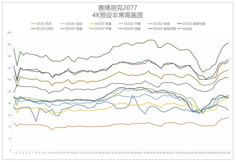通过记录同一段路径蜘蛛丝摆*和加速步行的画面帧数变化,不难看出在超分辨率(DLSS 2)开到高*能和DLSS关闭时的FPS曲线基本上一致。