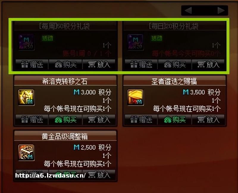 积分商城中每天可以领取20积分礼袋,每周能领取50积分礼袋。通过任务每周最多可以获取500积分,积分可用于兑换希洛克转移之石与圣者之赐福等奖励。
