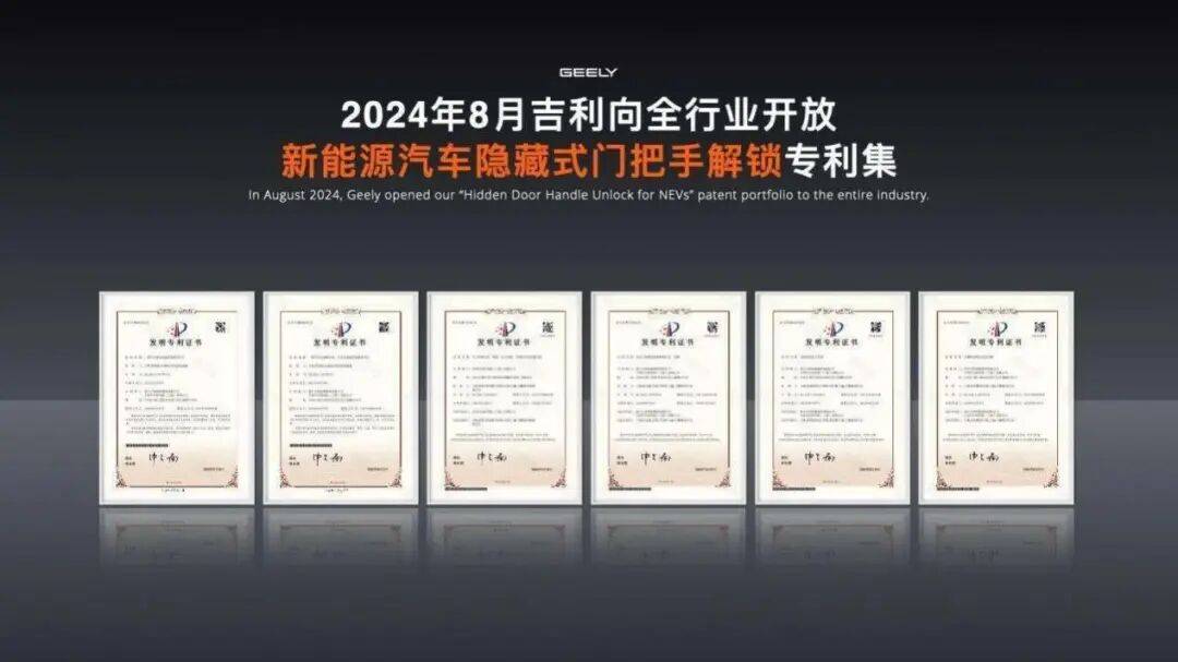 淦家阅在会上说:“在安全技术这条道路上,同行不是冤家,而是并肩战斗的守护者。”他举了几个已经落地的例子:当行业出现**式门把手在碰撞后无法弹出时,吉利开放门把手安全**;当行业出现车辆落水、断电时门窗难以打开,吉利开放一键破窗技术;为避免电动车因底部刮伤引发电池风险,吉利开放电池底部安全**。