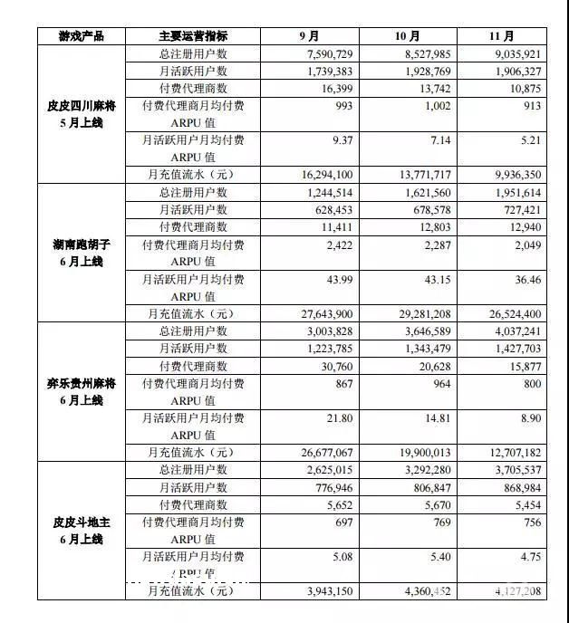 以乐玩为例,其自主**了《皮皮四川**》、《湖南***》、《弈乐贵州**》和《皮皮***》等几款**地方**游戏。公开资料显示,乐玩2016年7月11日月实现营业收入2.82亿元,净利润1.79亿元。其中,2016年1月上线的《皮皮四川**》收入9489.9万元,占比33.62%,其2016年11月、9月、10月的月充值流水分别为1629.41万元、1377.17万元、993.64万元。