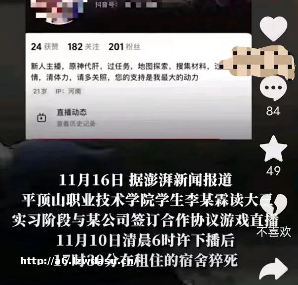2023年1月19日,河南平顶山一所学校的大三**李X霖,在做实习游戏“代*”主播通宵**后猝死,一个21岁的生命悄无声息地消失在声势浩大的虚拟世界。