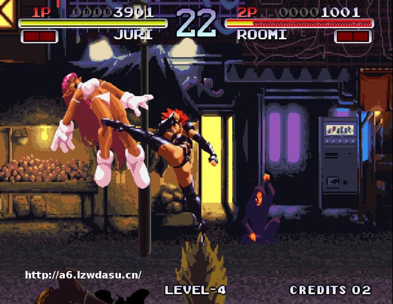 痛快进行曲,当年和《风云默示录》一样受欢迎。游戏中大部分角色的超必杀指令都有一点难度,和其他格斗游戏不同,是可以上下移动的,不在一条线上有可能会发不出必杀技。