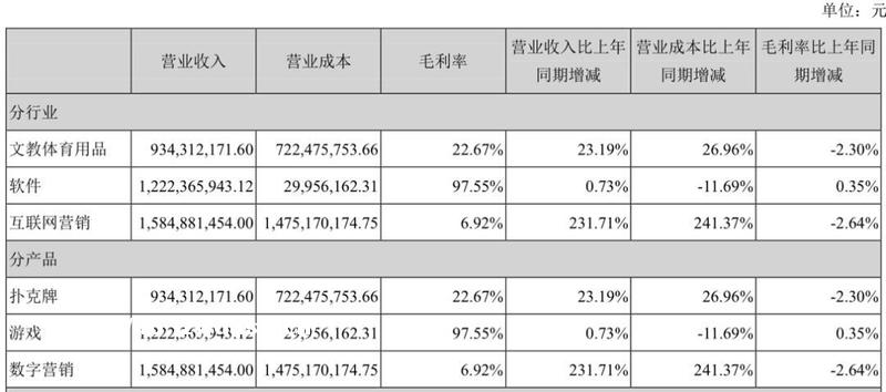 《**时报》研究员发现,尽管营收占比**,但数字营销业务毛利率却仅有6.92%,远低于***业务毛利率的22.67%和游戏业务毛利率的97.55%,这也成为该公司业绩呈现增收不增利的原因之一。