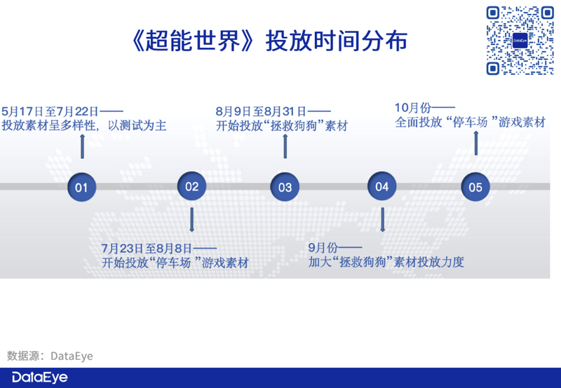 直到7月开始,《超能世界》才陆续确定了素材主题,转为“停车场”——“拯救狗狗”——“停车场”的集中投放,并开始加大买量,针对*爆量,渠道也逐渐转向字节系渠道的穿山甲联盟。
