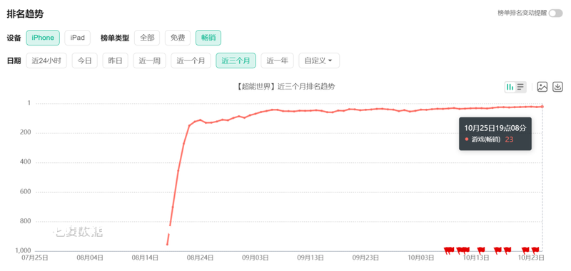 《超能世界》霸榜免费榜已经4天了,同时其目前**榜成绩也稳定在了20-30名左右,没有IP加持,但上线12月成绩曲线稳步上爬的产品。
