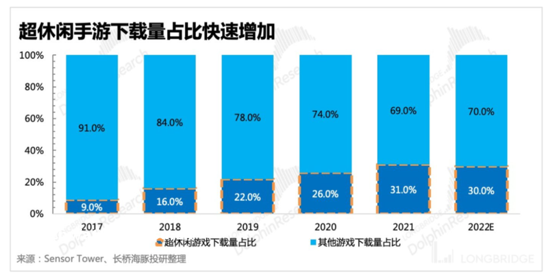 调优+超休闲素材买量打法,某种程度上也算是应运而生。在近两年间,超休闲游戏是增速最快的游戏品类,也拥有目前泛用户最多的流量池,且其买量成本相较于中重度游戏素材要便宜不少。
