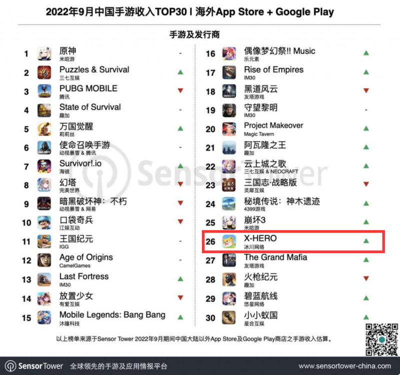而近期打造出了《超能世界》的冰川,也并不是**次尝试这种打法,旗下出海产品《X-HERO》在今年10月实现发行收入翻倍,首次入围中国手游发行商收入榜单Top30,就采用超休闲游戏素材化,获取了大量用户流量。