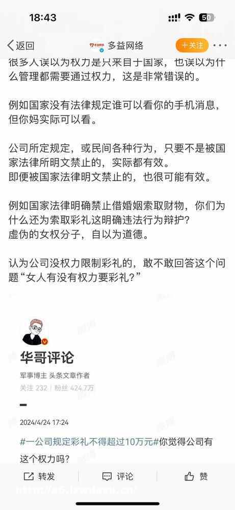 4月17日,多益发文称,公司规定:公司任何员工娶妻彩礼不得超过10万***价值,否则全公司通报批评并严惩。