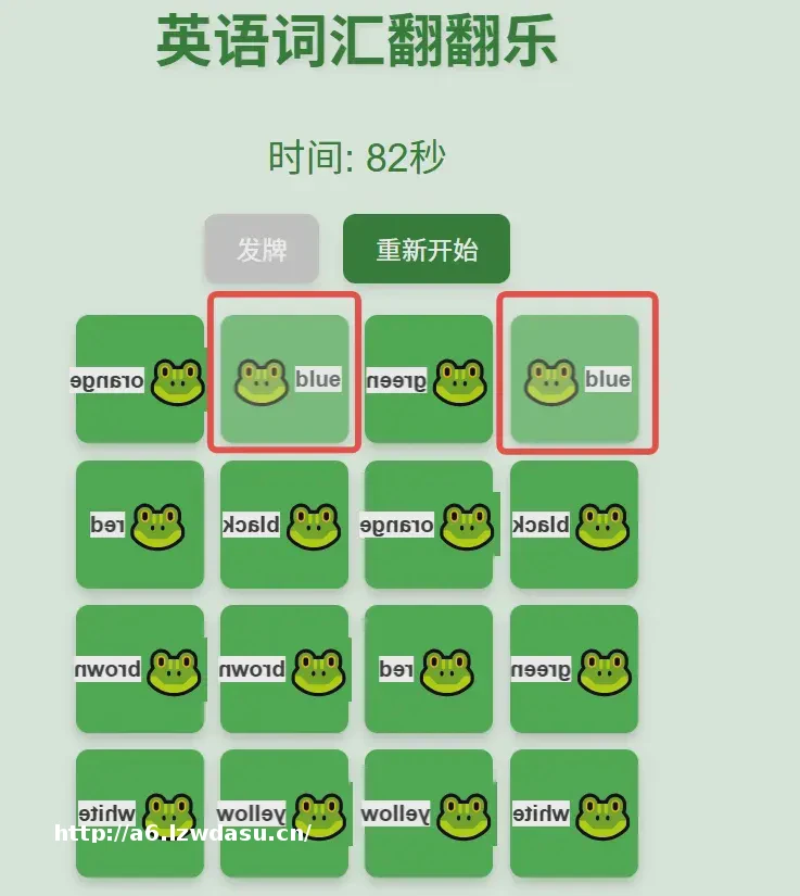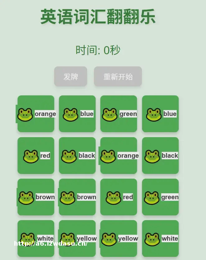 ,英语单词用小写字母表示。 3.16张牌中,有8对牌的英语单词是一样的,但是8对牌的位置是随机的。 4.格子下方有个“发牌”的按钮,用户点击”发牌”按钮,所有的牌正面朝上,显示出随机8组单词,5秒后所有牌翻转,背面朝上,只显示青蛙图标。 5.格子下方有个计时按钮,当牌背面朝上时,开始计时,鼠标任意点击一张牌的背面,牌翻转至正面,再次点击第2张牌的背面,翻转至正面。如果**张牌和第二张单词相同时则牌面保持正面向上,用户可以继续点击后续两张牌进行比较,看看是否单词相同。反之重新翻转到背面。 6.如果用户持续点击,找出所有相同的单词的牌面,则游戏结束,显示“Congratulations!”红色,字体要大,显示在格子中间并浮在牌的上面,同时停止计时。 7.在页面上方显示绿色大标题——英语词汇翻翻乐,页面背景为浅浅的绿色。】