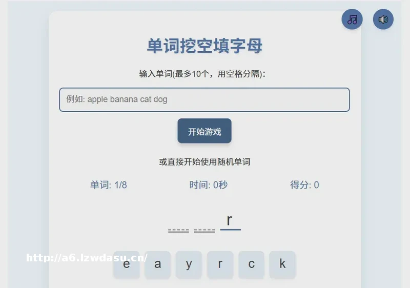 实现为单文件:1、游戏核心玩法: - 游戏开始前需要输入10个以内的单词,以空格分割 - 如果不输入单词,则随机选择从预设的100个儿童英语单词中选择5-10个 - 游戏开始后按照顺序从输入的依次选择一个展示,并随机将单词中1-3个字母以空格展示,但是缺少字母的数量不能等于或者超过单词的总字母数量 - 随机生成一批,不超过6个,这批字母必须包含上面单词缺少的部分 - 点击一个字母,就将字母依次从左到右填入到单词的空格处,检查单词是否正确 - 如果单词填写正确则所有字母依次变绿,然后展示下一个单词,如果错误,则依次变红,清空空格上面的字母,重新选 - 如果一个单词展示出来,10秒还没有被填写正确,则展示一个提示按钮 - 点击提示按钮,则在字母区所有需要填写的字母变成绿色 - 游戏开始后进行计时,游戏结束后停止计时,同时计算得分 - 得分计算公式:总时长(秒)-单词个数*5(秒),如果结果小于等于0,则为100分。游戏结束 - 游戏结束后,提供重新开始的选项2、8位风格音乐和音效系统(使用Web Audio API): - 点击字母格子音效 - 单词匹配成功音效 - 游戏结束音效 - 使用Web Audio API创建简单的循环背景音乐 - 音乐应符合8位游戏风格,使用简单的音符序列 - 提供音效和背景音乐切换按钮】