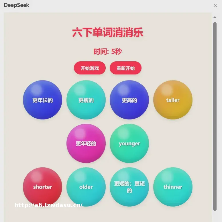 网页,采用小红书卡片风格。网页背景为米白色,顶部显示“六下单词消消乐”大标题。泡泡使用3D立体效果,颜色随机生成,每个泡泡上写有英文单词或中文释义,字体颜色为白色,字体加大加粗,每个单词或释义只出现一次,泡泡之间保持一定距离,每行显示4个泡泡。点击两个泡泡,如果它们的英文和中文匹配,则泡泡消失并播放“叮”音效,否则泡泡恢复原状,播放错误提示音的音效。点击一个泡泡时,它会高亮显示,并播放“pop.mp3”音效。所有泡泡都匹配并消失后,显示“恭喜你挑战成功!中文生词和匹配的英文翻译如下: younger 更年轻的 older 更年长的 taller 更高的 shorter 更矮的;更短的 longer 更长的 thinner 更瘦的】