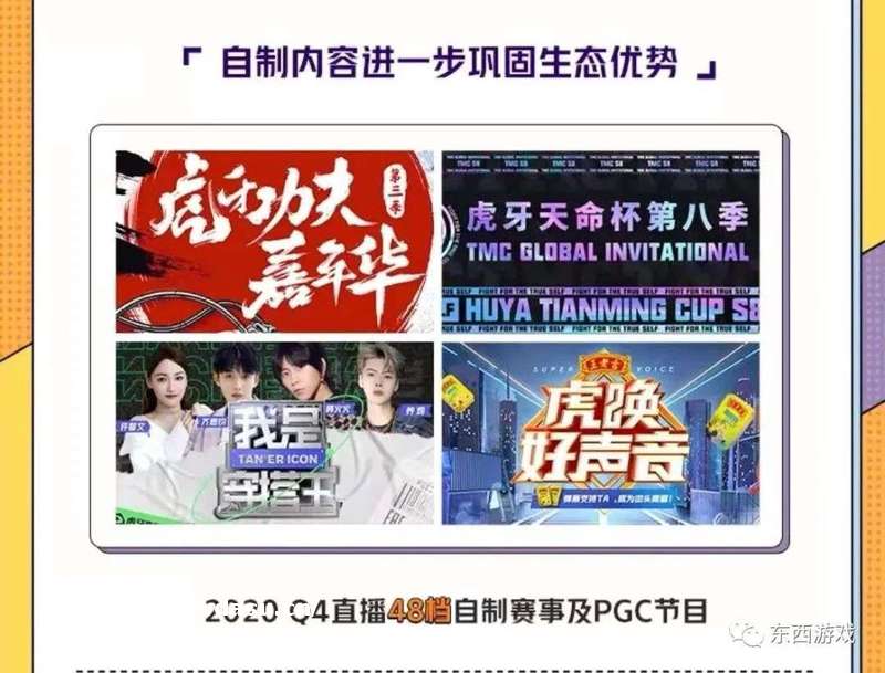 在**内容上,比如**电竞赛事《第八届虎牙天命杯》和赛事解说节目《虎说S10》等,另一方面依托主播资源打造**内容,比如户外**秀《虎唤好声音》和跨界格斗节目《虎牙功夫嘉年华》。