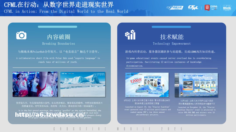 与此同时,CF手游的职业联赛体系(CFML)也深度融入公益探索。例如登上COP30的“冰川保卫者”计划,早在今年6月,其同名活动便在游戏端内得以上线,截至目前已有超过1200万名用户主动在游戏中学习了冰川保护知识。