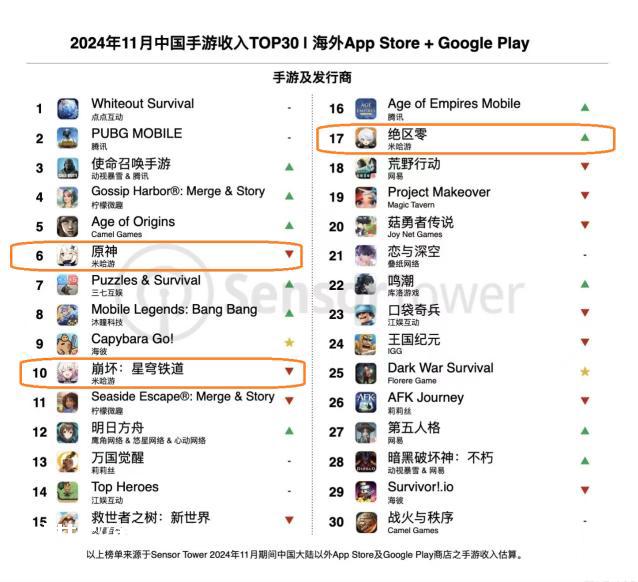 2024年12月“中国手游收入***30|海外App Store+Google Play”,《绝区零》仅仅位列第十七位,落后于《原神》与《崩坏:星穹铁道》。
