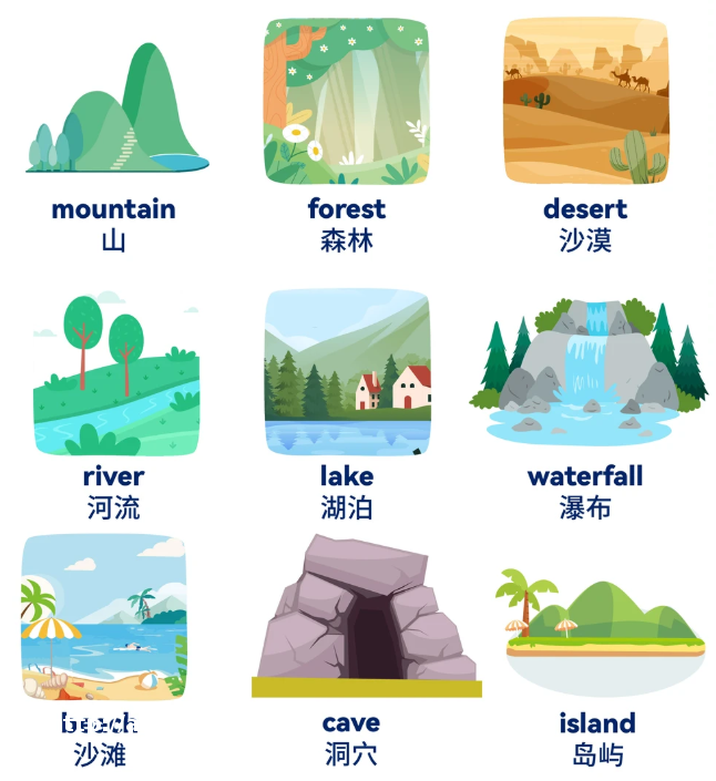 山:**个音节像猫叫“喵”(**ʊ),但拉长成“猫—嗯”就是“山”的起头!爬“山”好累,终点(tain)像轻轻的“tin”(罐头),所以是“猫嗯-tin”。