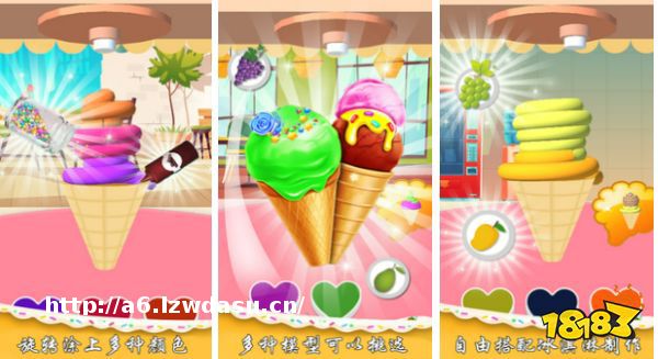 那么,在游戏中,小朋友们将会来到漂亮的冰淇淋店,小朋友们可以旋转冰淇淋,然后涂上自己喜欢的颜色,还有不同的模型能够挑选,搭配上自己喜欢的水果和元素,制造出漂亮的冰淇淋雪糕!