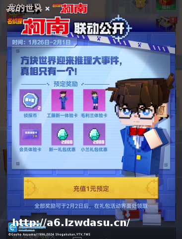 而在正式开启推理之旅前,柯南已经率先来到方块世界为冒险家们送福利啦!从即日起,冒险家只需充值1元,超值优惠不容错过,快来预约豪礼欢迎柯南的到来吧!