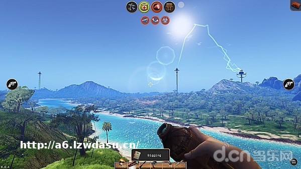 想要在辐射岛上生存,首先你要学会寻找食物,你必须学会如何获取营养,寻找散布在岛上的水果,来获得动物肉类。在屏幕的上方玩家会看到有一个十字标志,那是玩家的生命值,然后右边类似肉的标志是我们的健康值也就是饥饿值,当自己变得饥饿的时候就会变得很虚弱,所以玩家要及时补充自己的能量以备不时之需。