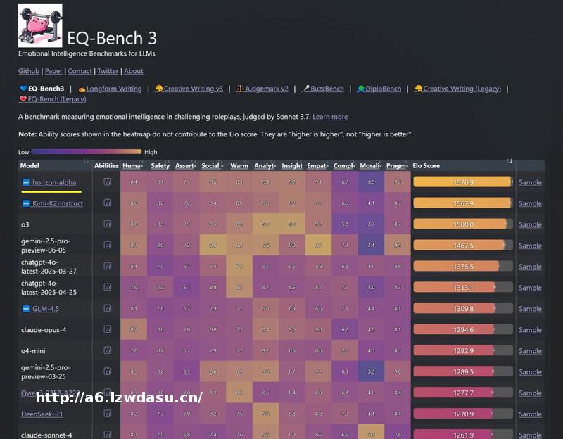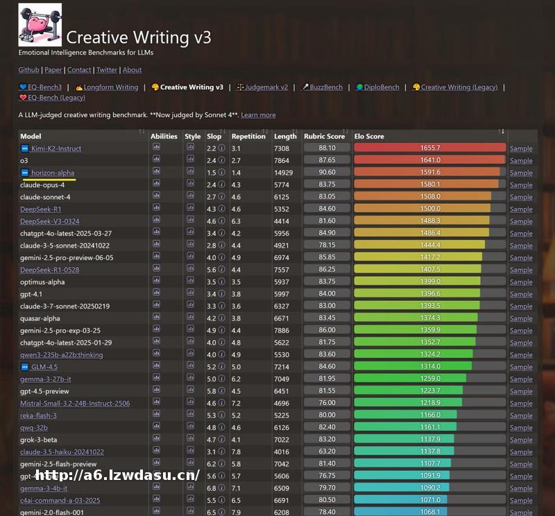 在写作EQ-Bench基准测试中,Horizon Alpha位列**,远超o3、Gemini 2.5 Pro。