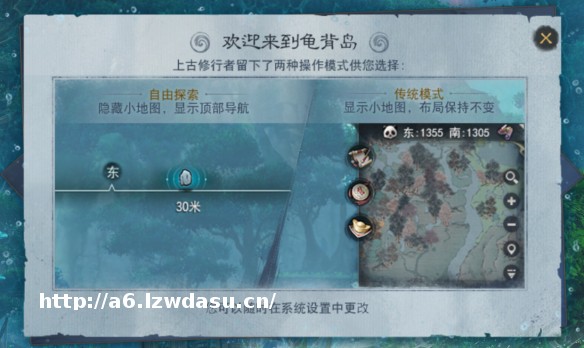 初登龟背岛,会发现上古修行者留下了【自由探索】、【传统模式】两种操作模式。