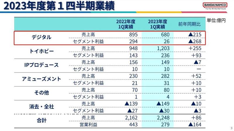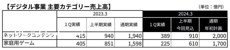 财报说明会后发布的提问应答概要中提到,本期出现利润额下降超过销售额的主要原因在于,数字业务中主机游戏的高利润率产品销售数量减少了。具体来说,与去年同期相比,