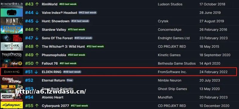5月28日-8月3日Steam销量周榜中《艾尔登法环》跌出前50