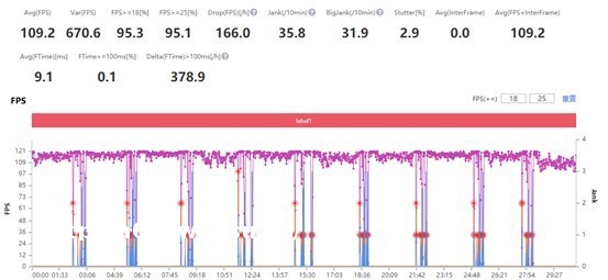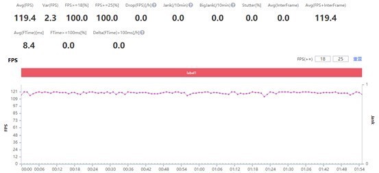 以一*(2分钟)与30分钟时长分别做出测试。游戏开始前,先将画质设置成超高,分辨率为超清,超高帧率、关闭省电模式以此展示CPU在高强度条件下它的能表现;在**次测试时跑出了平均119.4帧的好成绩,在连续30分钟不间断测试中也是达到了109.2帧的平均帧率,注意每一次大幅度掉帧都是上把游戏结束与下把游戏开始,在游戏体验中也并未出现卡顿的情况。