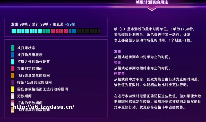比如街霸6中的训练室里就能打开帧数选项查看每一招的帧数。其中堪称最赖皮技能之一的肯的迅雷脚3段,看着像是连招,但其实在第二段防住后,直到第三段中间,帧数上是刚好能满足一个轻拳的插入,但如果你对帧数不了解,就基本不会抢招,只能被动防守。所以格斗游戏玩家也被称为“生存在1/60秒世界的人”。